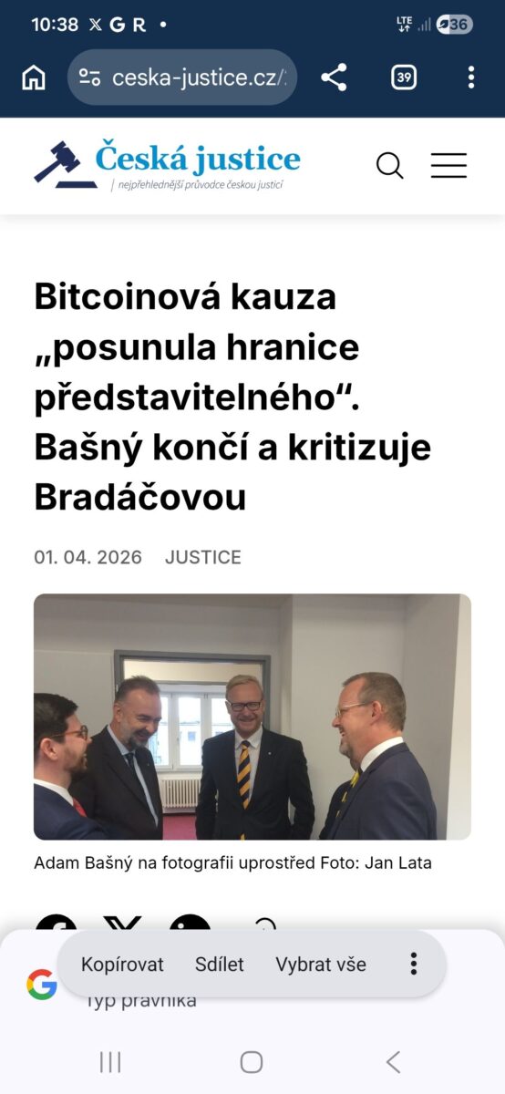 Znepokojivá slova státního zástupce Adama Bašného, který se rozhodl po jmenování Pavla Zemana Evropským žalobcem za ČR kvůli situaci v soustavě státního zastupitelství skončit ve funkci: „Vedení NSZ a VSZ v Olomouci svým jednáním a prezentací v tzv. kauze bitcoin posunulo hranice představitelného“. Celé vyjádření v komentáři.